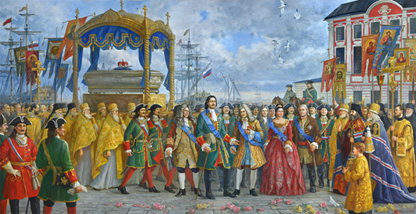 Художником тщательно отработан и подан «реквизит» исторической реконструкции — костюм гардемарина и обмундирование моряков (камзол, штиблеты, шляпа-треуголка, бострог, чирики, кафтан), одежда духовных лиц (риза, ряса, омофор, митра, клобук), запрестольные кресты, хоругви с размещёнными на них церковными иконами и празднично оформленные царские носилки, где по описанию «На крышке ковчега изображена бархатная лазоревая подушка, обложенная золотым позументом и 4 золотых кисти; на подушке находилась «шапка княжеская» малинового бархата, накрест обложенная золотым позументом и опущенная горностаем с серебряным вызолоченным крестом. На подушке лежит крест».